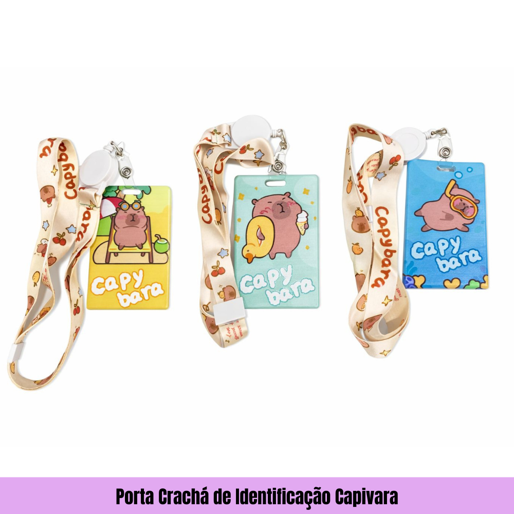 O porta-crachá de capivara é um acessório funcional e fofo, com estampas ou modelos emborrachados (estilo kawaii) que trazem a capivara, animal sensação do momento. Geralmente feito de plástico ABS resistente, possui cordão personalizado, janela transparente para identificação e é ideal para o dia a dia no trabalho, escola ou eventos.